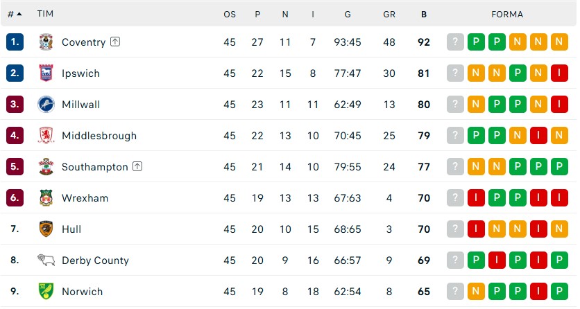 Milvol je trenutno treći sa 80 bodova i gol razlikom +13, dok Midlzbro zauzima četvrto mesto sa 79 bodova i gol razlikom +25. Poslednji dan sezone doneće direktne okršaje: Ipsvič dočekuje Kvins Park Rendžerse, Milvol igra sa Oksfordom, a Reksam dočekuje Midlzbro.